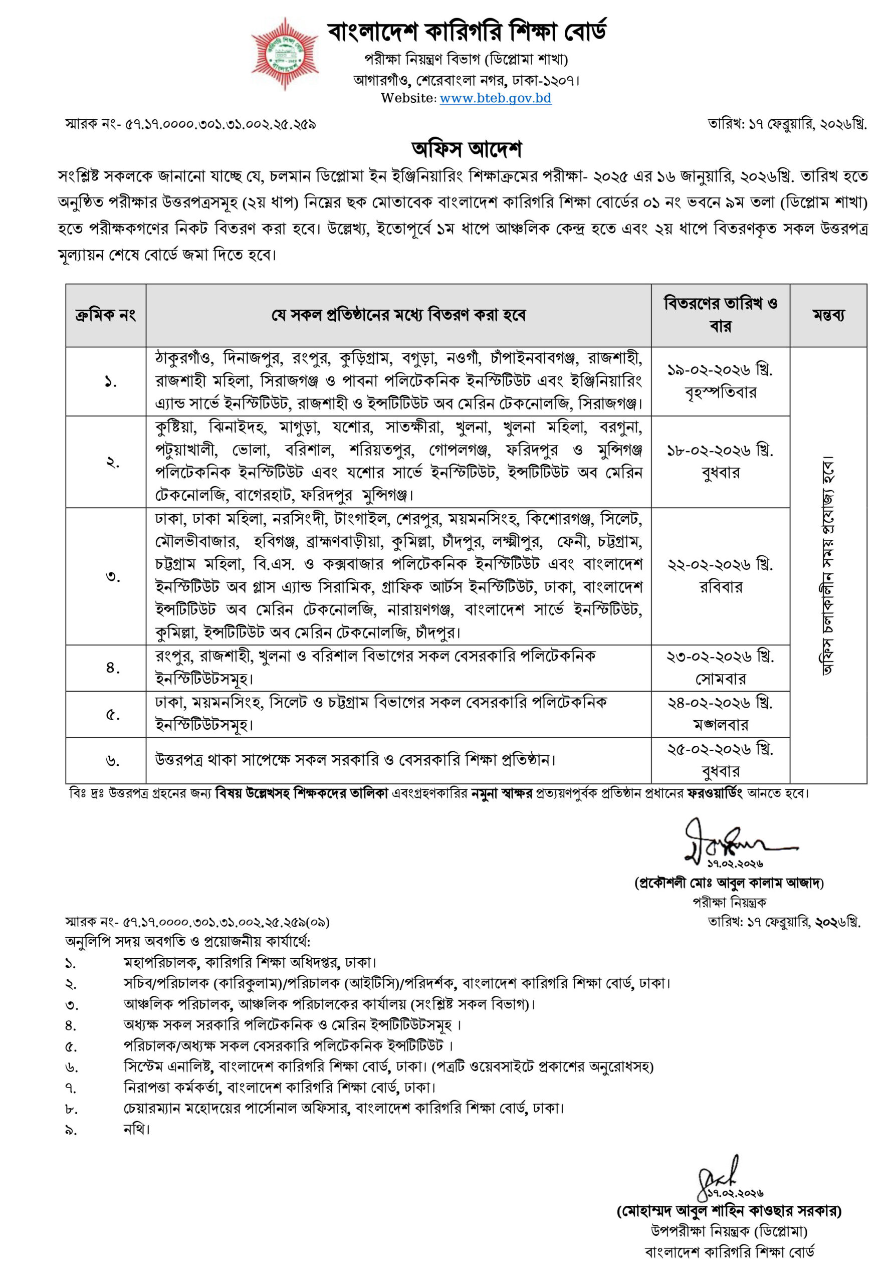 ডিপ্লোমা ইন ইঞ্জিনিয়ারিং শিক্ষাক্রমে পরীক্ষার উত্তরপত্র বিতরণ সংক্রান্ত অফিস আদেশ