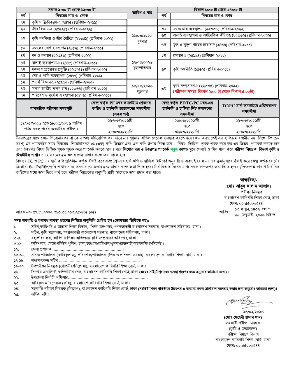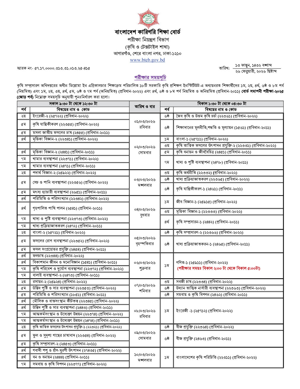 ডিপ্লোমা ইন এগ্রিকালচার শিক্ষাক্রম পরিচালিত ১৮টি সরকারি প্রতিষ্ঠানে বোর্ড সমাপনী পরীক্ষা-২০২৫ এর সময়সূচি প্রকাশ