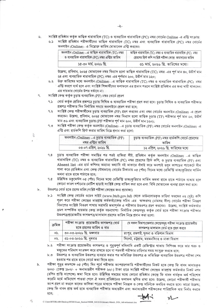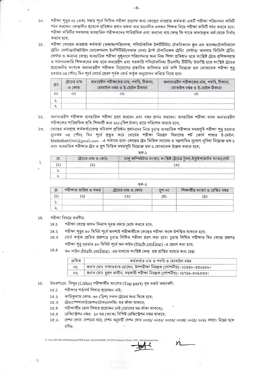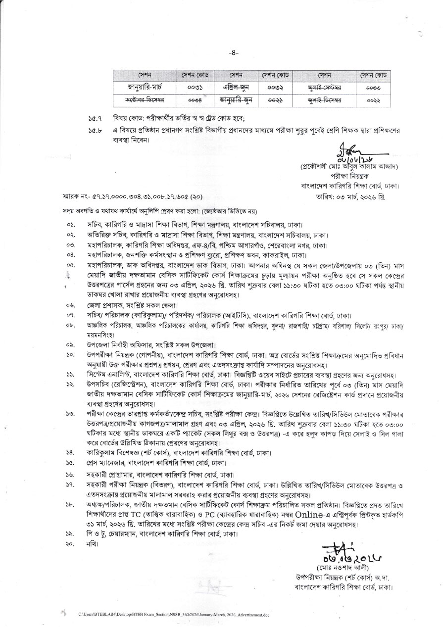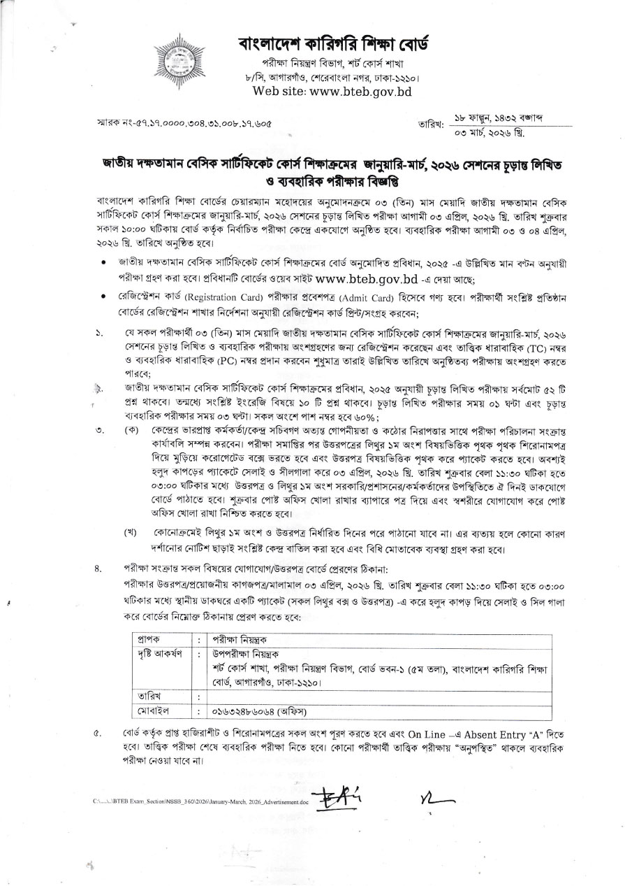 জাতীয় দক্ষতামান বেসিক (৩৬০ ঘন্টা) শিক্ষাক্রমের জানুয়ারি-মার্চ, ২০২৬ সেশনের চূড়ান্ত লিখিত ও ব্যবহারিক পরীক্ষার বিজ্ঞপ্তি