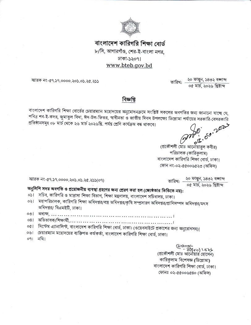 ডিপ্লোমা পর্যায়ের প্রতিষ্ঠানসমূহে ০৮-২৬ মার্চ শ্রেণি কার্যক্রম বন্ধের নোটিশ