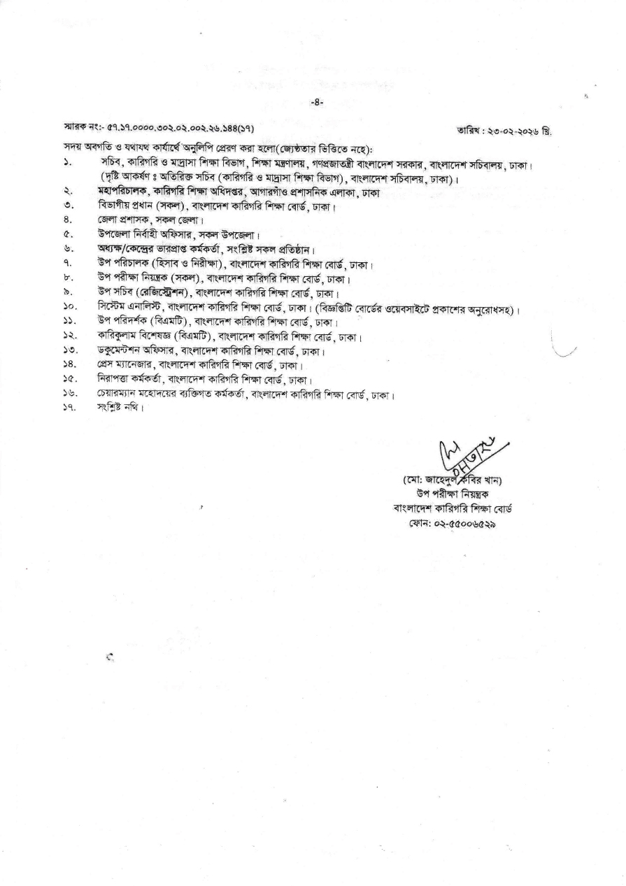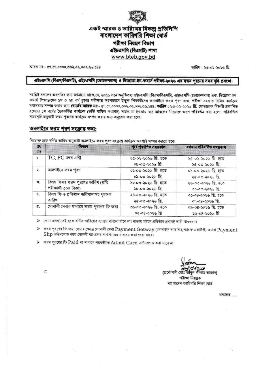 এইচএসসি (বিএম/বিএমটি), এইচএসসি (ভোকেশনাল) ও ডিপ্লোমা-ইন-কমার্স পরীক্ষা-২০২৬ এর ফরম পূরনের সময় বৃদ্ধি প্রসঙ্গে