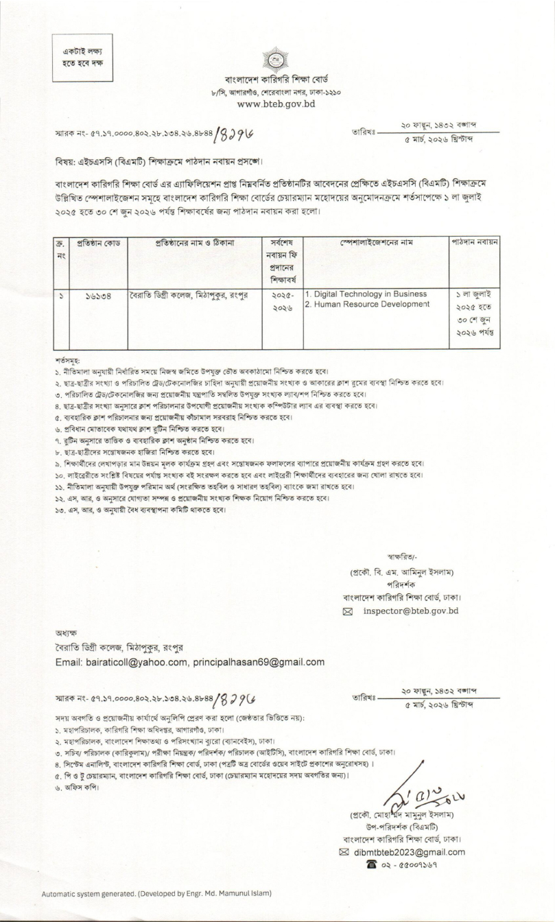 এইচএসসি (বিএমটি) ও এইচএসসি (ভোকেশনাল) শিক্ষাক্রমের ২০২৫-২৬ শিক্ষাবর্ষের শিক্ষার্থীদের অনলাইনে ৪র্থ বিষয় সংযোজন করার বিজ্ঞপ্তি