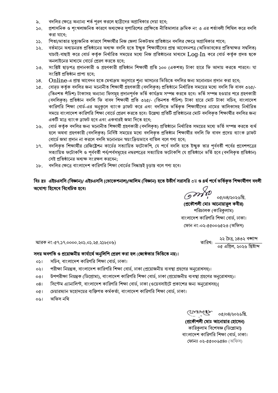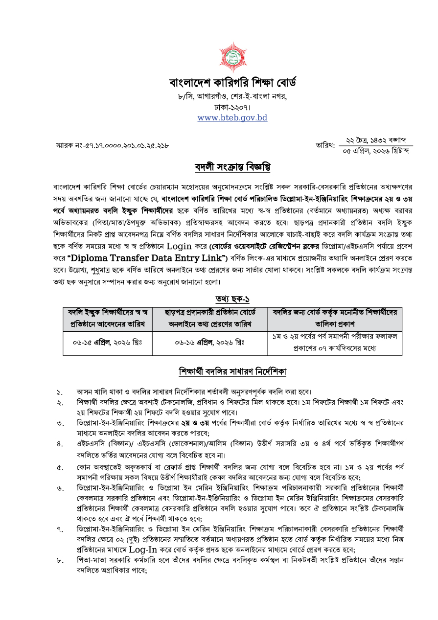 ডিপ্লোমা ইন ইঞ্জিনিয়ারিং শিক্ষাক্রমে শিক্ষার্থী বদলী সংক্রান্ত বিজ্ঞপ্তি