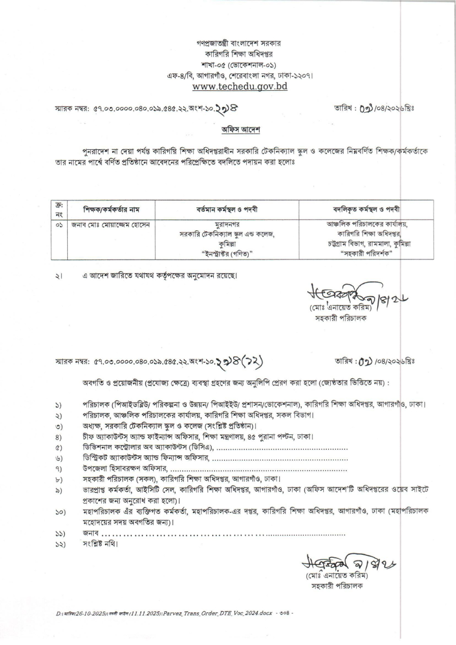 বদলিতে পদায়নের প্রজ্ঞাপন (২ জন, পলিটেকনিক)