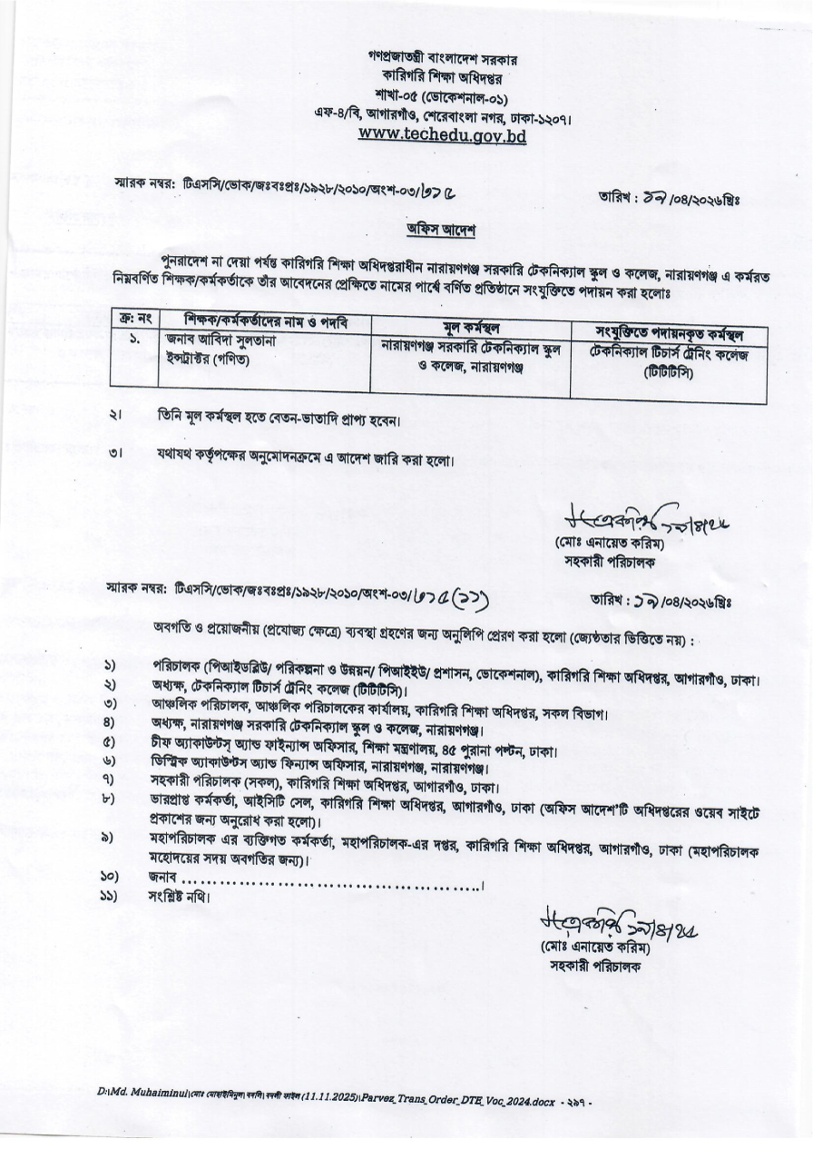 বদলিতে পদায়নের প্রজ্ঞাপন (২ জন, পলিটেকনিক)