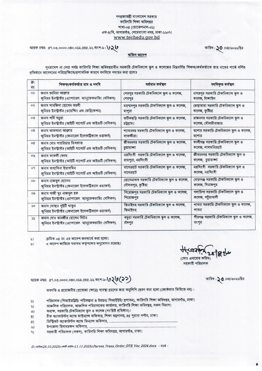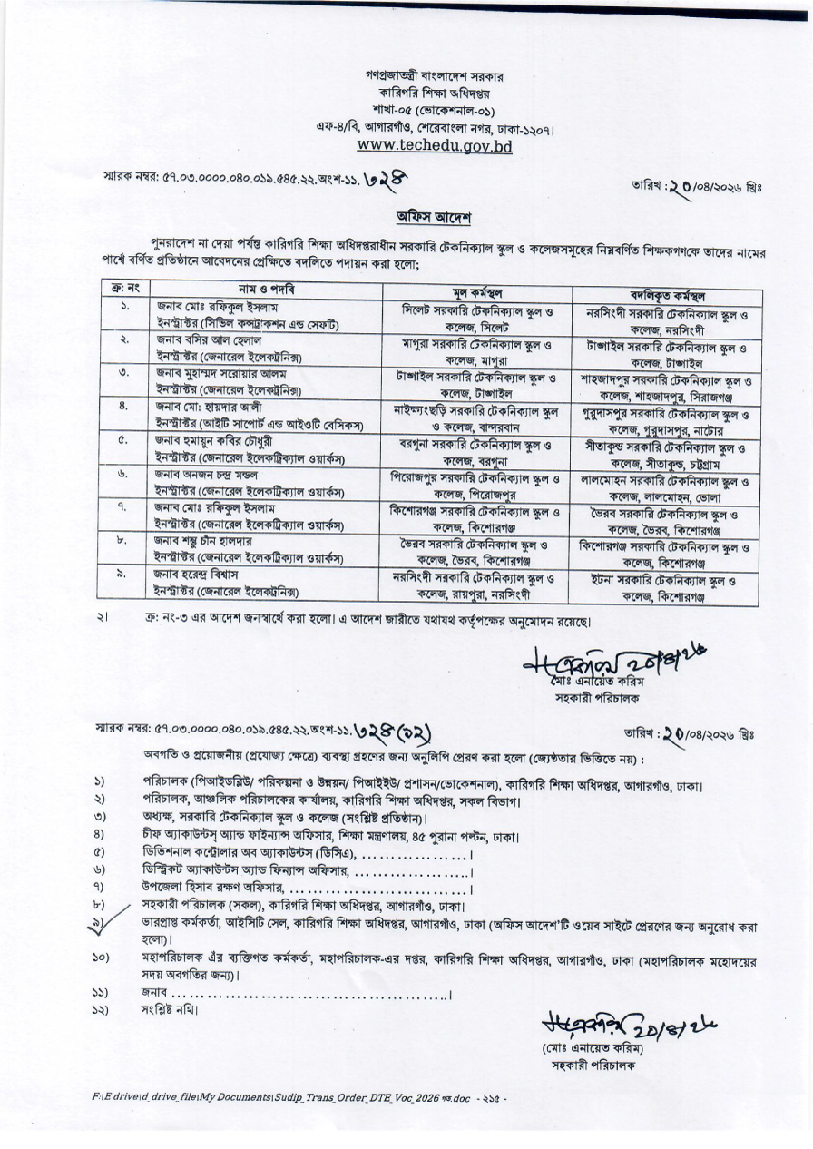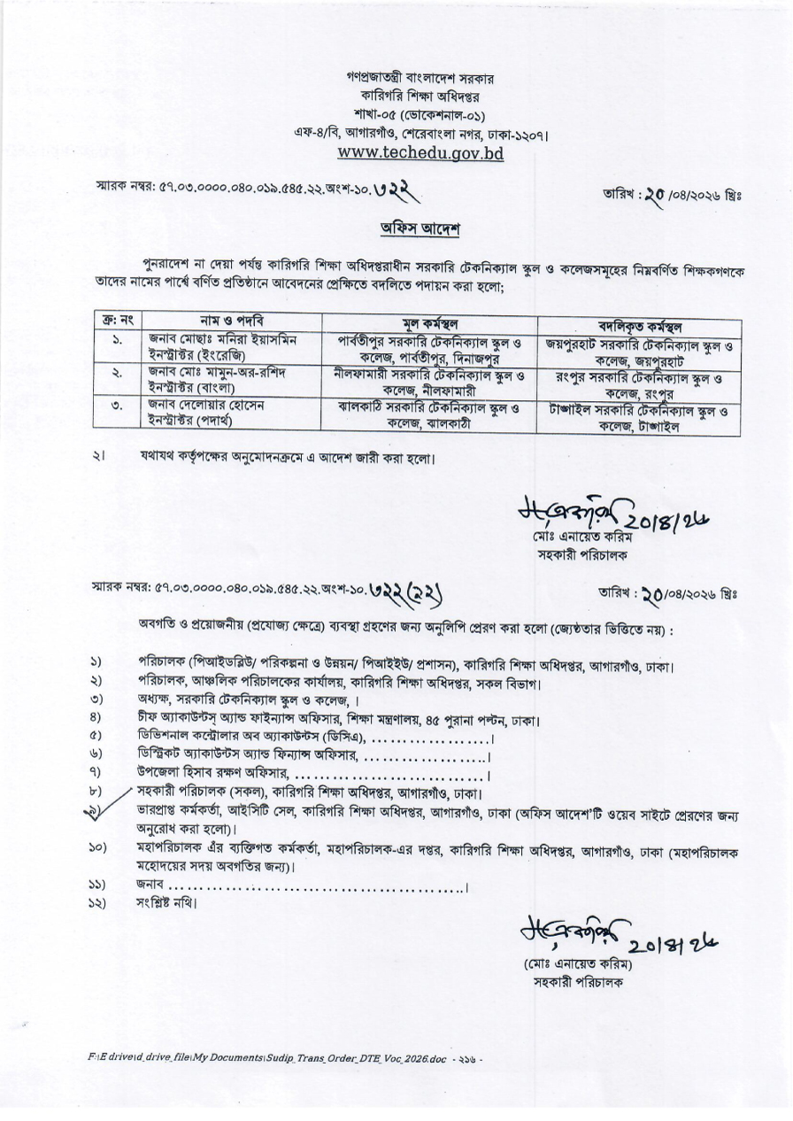 বদলিতে পদায়নের প্রজ্ঞাপন (২ জন, পলিটেকনিক)